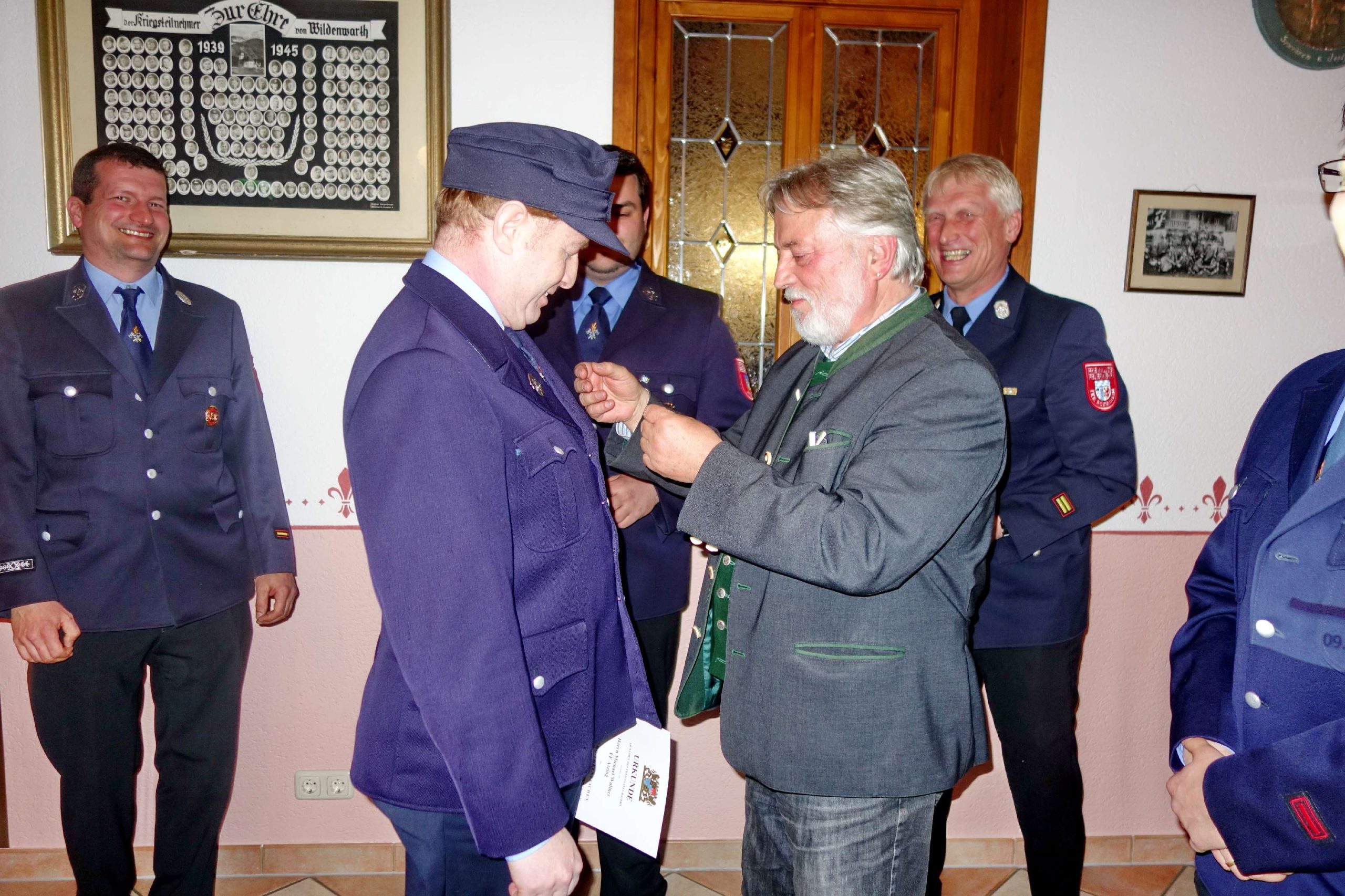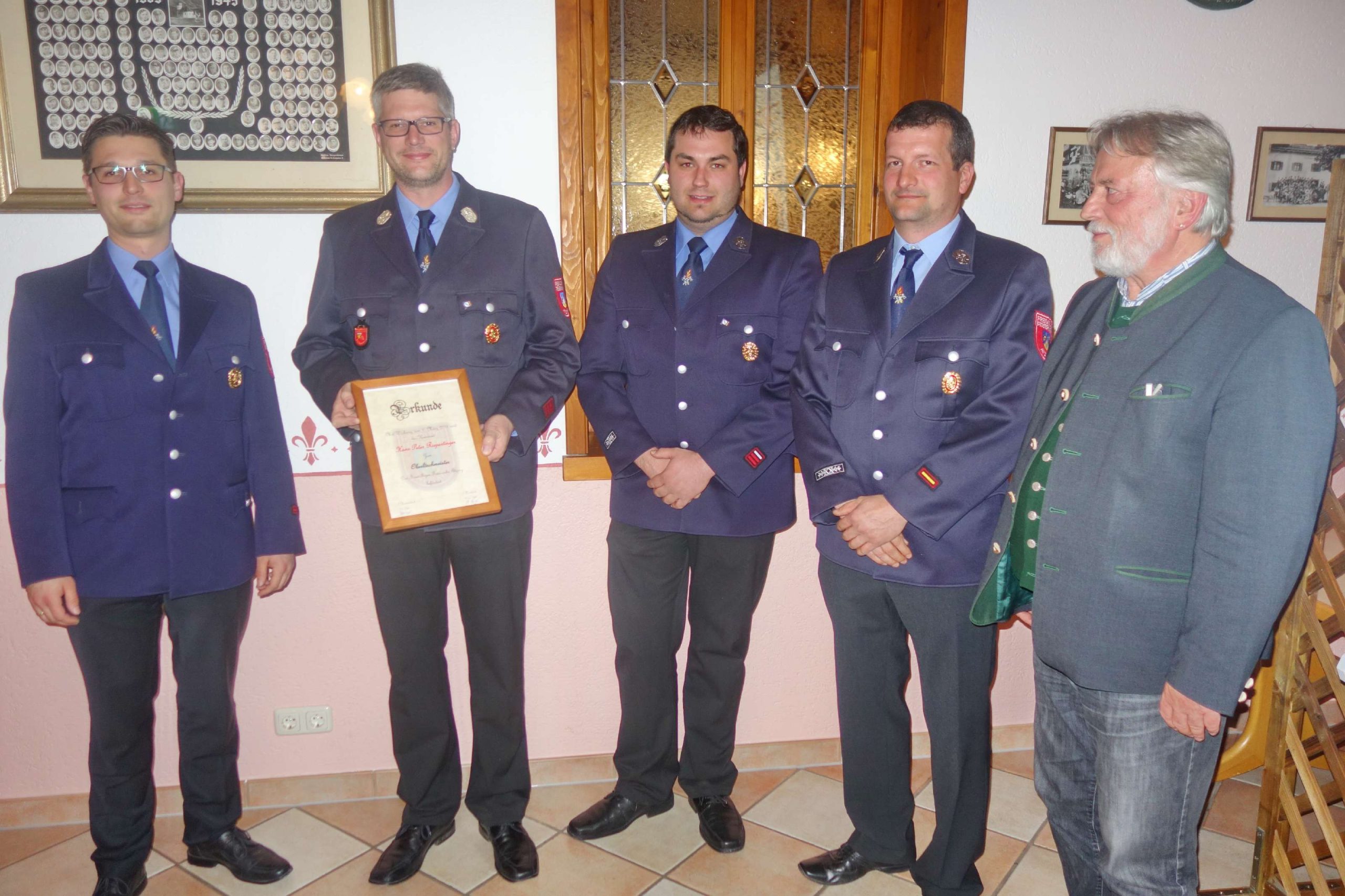 Für inzwischen 25 Jahre aktiven Dienst konnten Kreisbrandmeister Rainer Tippel und Dritter Bürgermeister Alfred Schelhas Michael Wallner auszeichnen. Wallner hat 1993 mit dem ersten Leistungsabzeichen begonnen und diese Fortbildung mit der höchsten Stufe Gold-Rot abgeschlossen. Dafür gab es eine von Bayerns Innenminister Joachim Herrmann unterschriebene Urkunde. Eine weitere Urkunde erhielt der vormalige Kommandant Hans-Peter Riepertinger, er wurde aufgrund seiner Fortbildungs- und Übungsfreuden zum Oberlöschmeister ernannt, auch er bekam eine Urkunde.