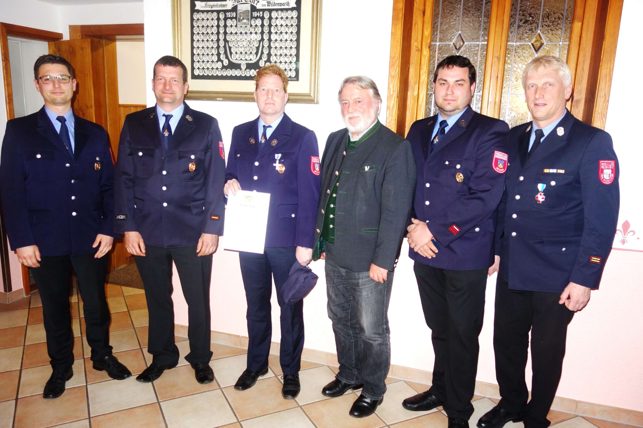 - Von links: Vorstand Martin Loferer, 1. Kommandant Paul Huber junior, Michael Wallner (Ehrung für 25 Jahre aktiven Dienst), 3. Bürgermeister Alfred Schelhas, 2. Kommandant Bernhard Summerer und Kreisbrandmeister Rainer Tippel.