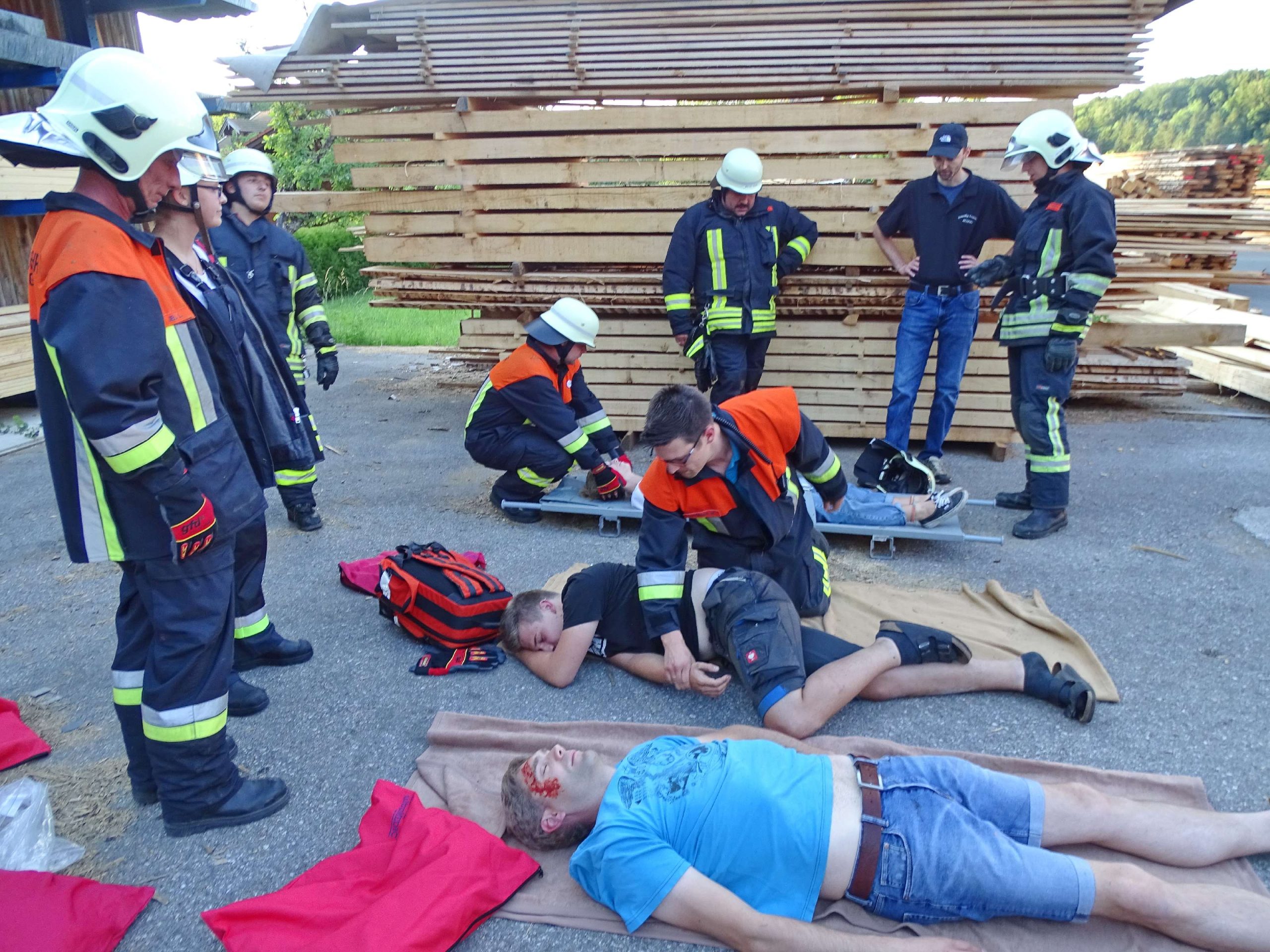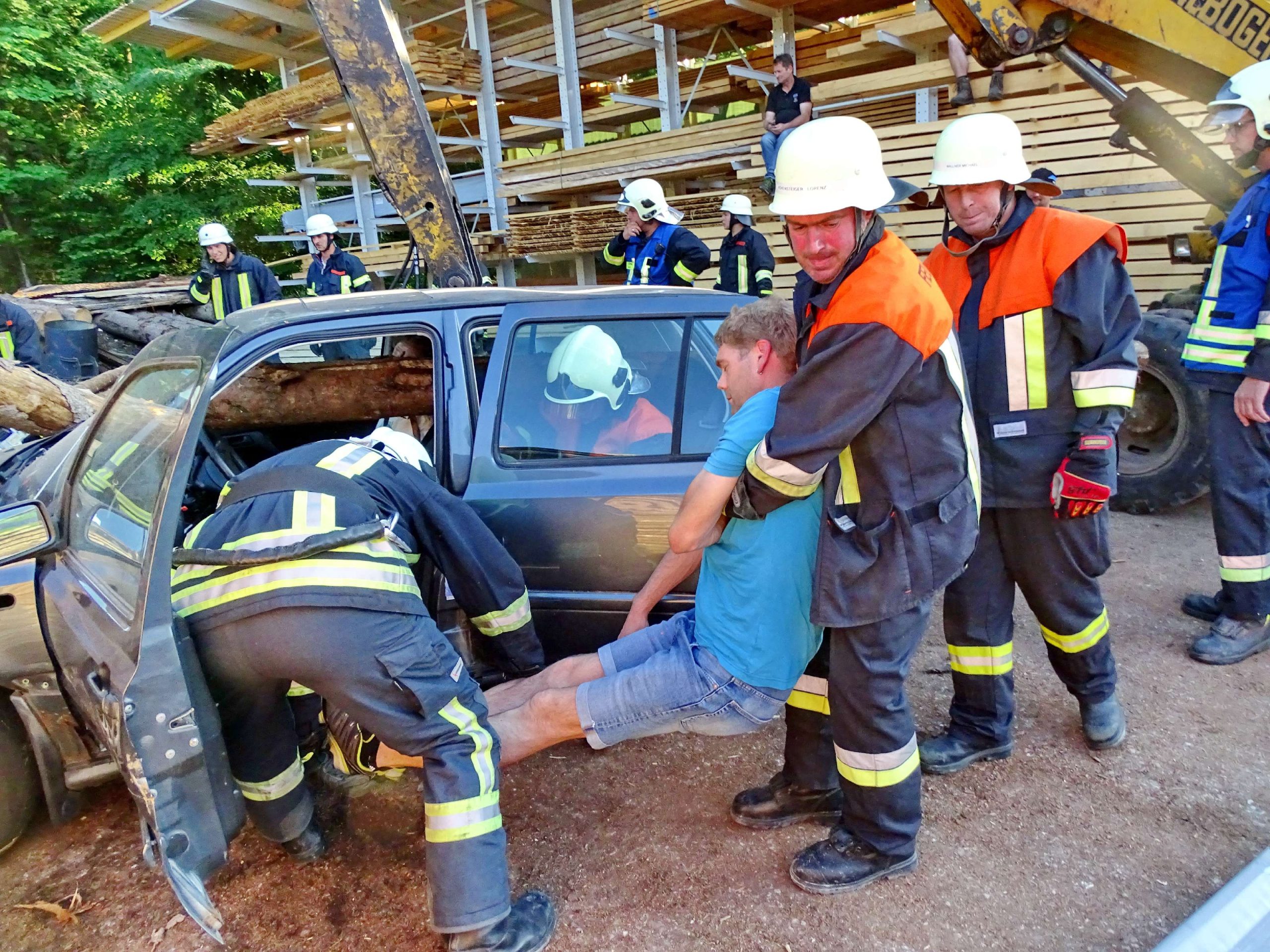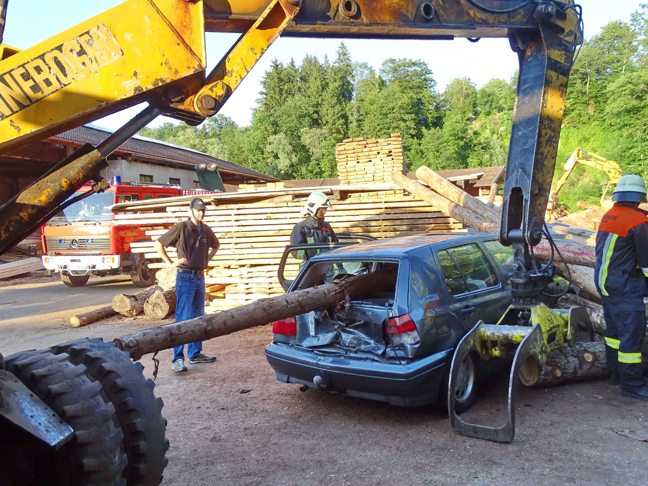 Eine defekte Baggerzange, Holzstämme, die auf ein Auto fielen und sich ins Innerste bohrten, mehrere verletzte Personen sowie ein während des Einsatzes in Brand geratenes Fahrzeug waren Eckpunkte eines angenommenen Unfalls im Sägewerk Rinser in Prien-Kaltenbach. Für diesen Übungs-Einsatz rückte die Feuerwehr Atzing mit ihren Fahrzeugen 65/1 und 43/1, mit 26 Feuerwehrmännern und zwei Feuerwehrfrauen sowie mit Zweiten Kommandanten Bernhard Summerer als Einsatzleiter heran. Die Holzstämme wurden mittels Motorsäge und Muskelkraft vom Auto beseitigt und die verletzten Personen konnten aus dem Auto befreit und durch die Feuerwehr versorgt werden. Zwei Trupps löschten zeitgleich das in Brand geratene Auto ab.