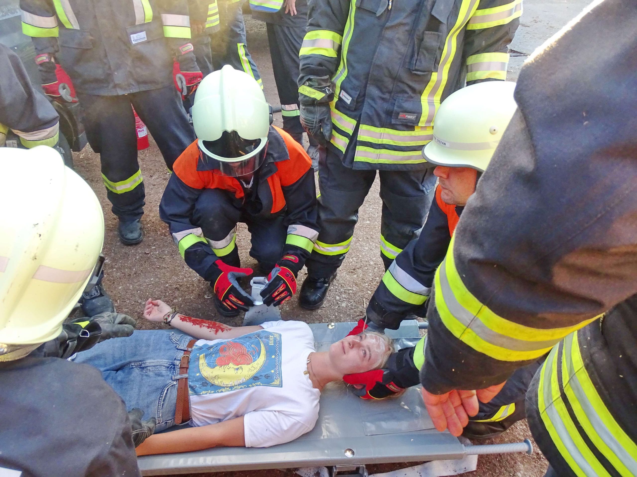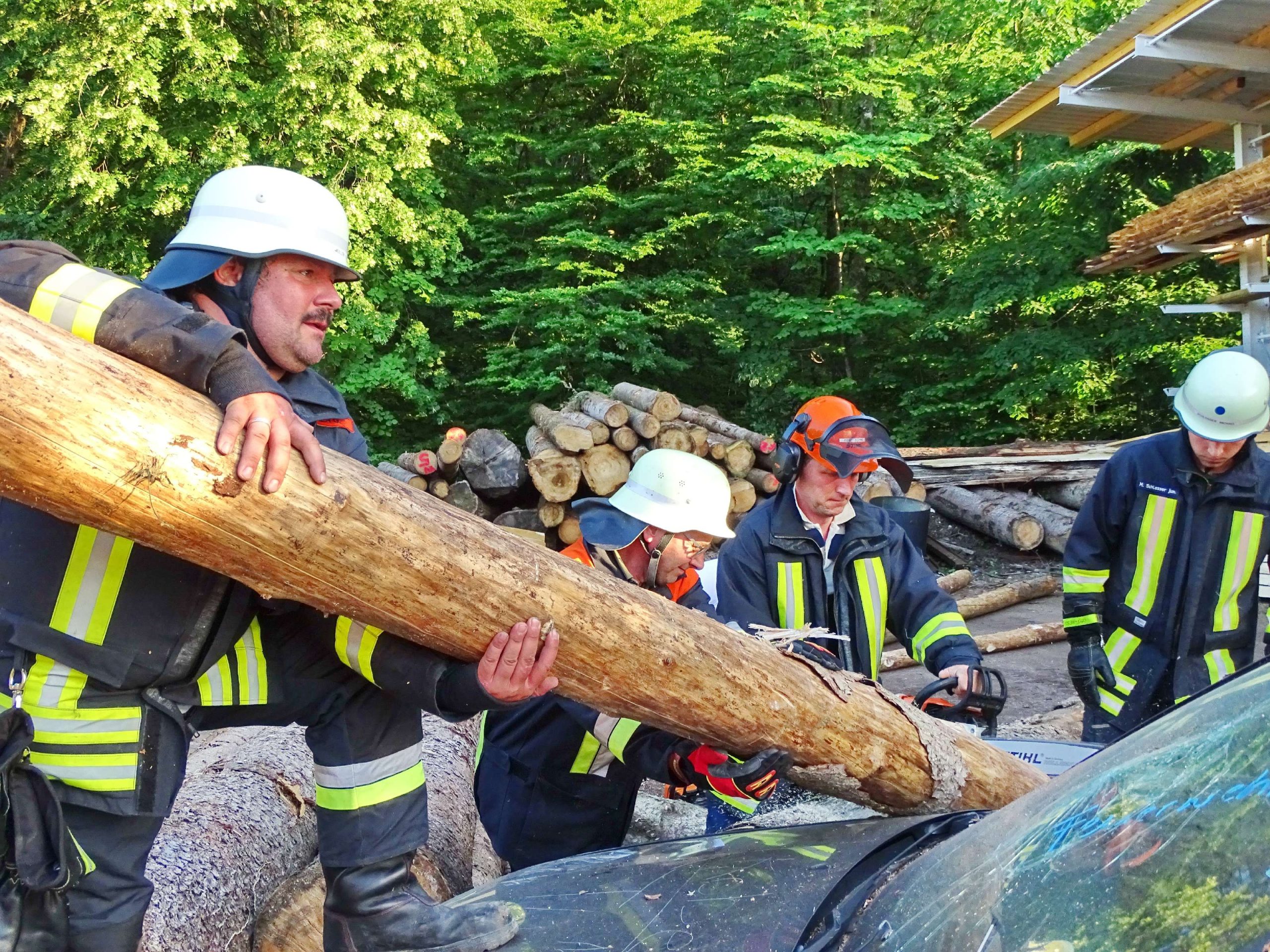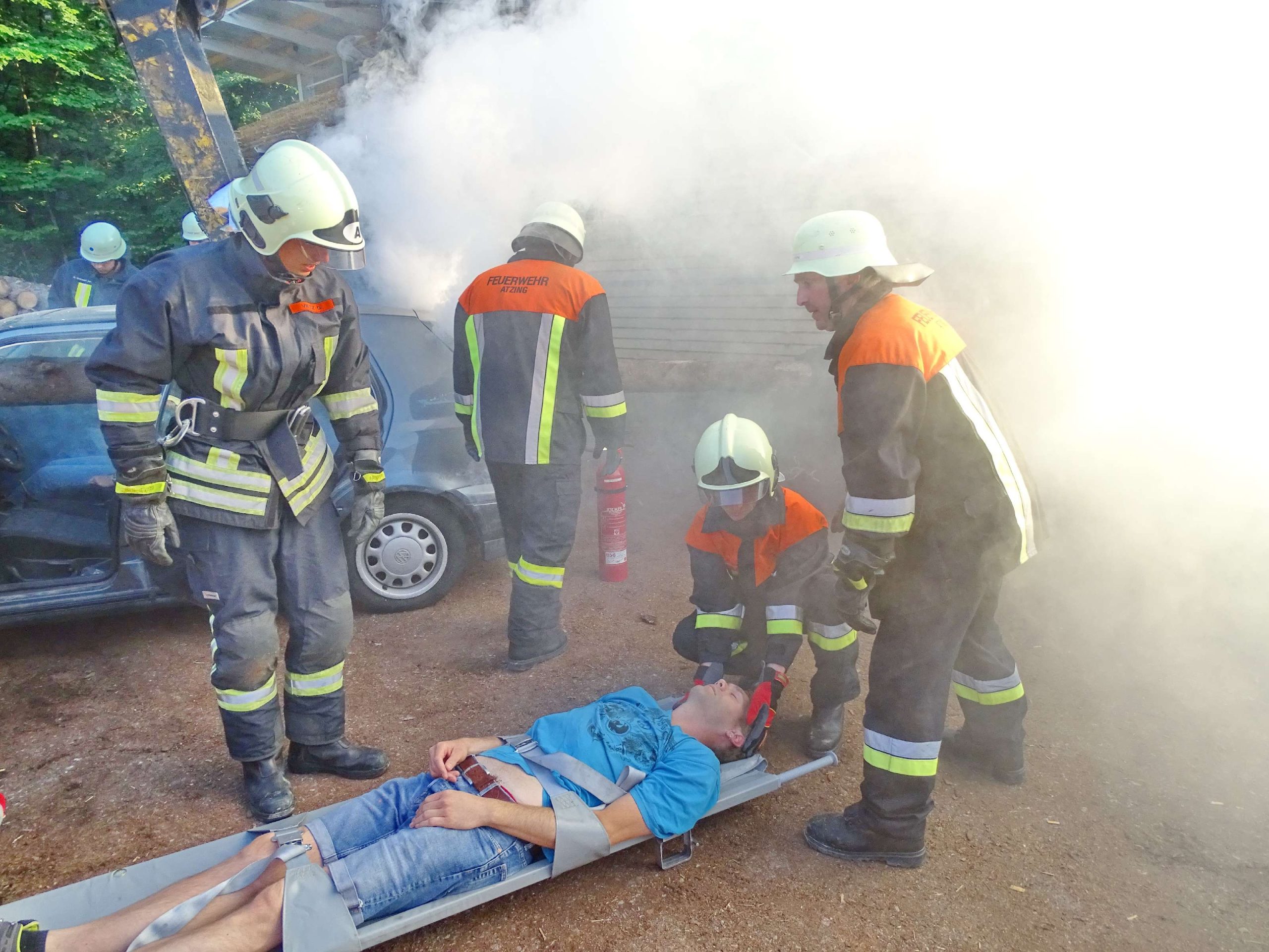 Eine defekte Baggerzange, Holzstämme, die auf ein Auto fielen und sich ins Innerste bohrten, mehrere verletzte Personen sowie ein während des Einsatzes in Brand geratenes Fahrzeug waren Eckpunkte eines angenommenen Unfalls im Sägewerk Rinser in Prien-Kaltenbach. Für diesen Übungs-Einsatz rückte die Feuerwehr Atzing mit ihren Fahrzeugen 65/1 und 43/1, mit 26 Feuerwehrmännern und zwei Feuerwehrfrauen sowie mit Zweiten Kommandanten Bernhard Summerer als Einsatzleiter heran. Die Holzstämme wurden mittels Motorsäge und Muskelkraft vom Auto beseitigt und die verletzten Personen konnten aus dem Auto befreit und durch die Feuerwehr versorgt werden. Zwei Trupps löschten zeitgleich das in Brand geratene Auto ab.
