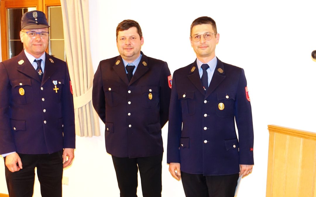 Fotos: Hötzelsperger –  Dank für eine enorme Feuerwehr-Ehrenamtsleistung für Willi Feichtner (li.) durch den neuen Vorstand Stefan Meier und seinem Vorgänger Martin Loferer.