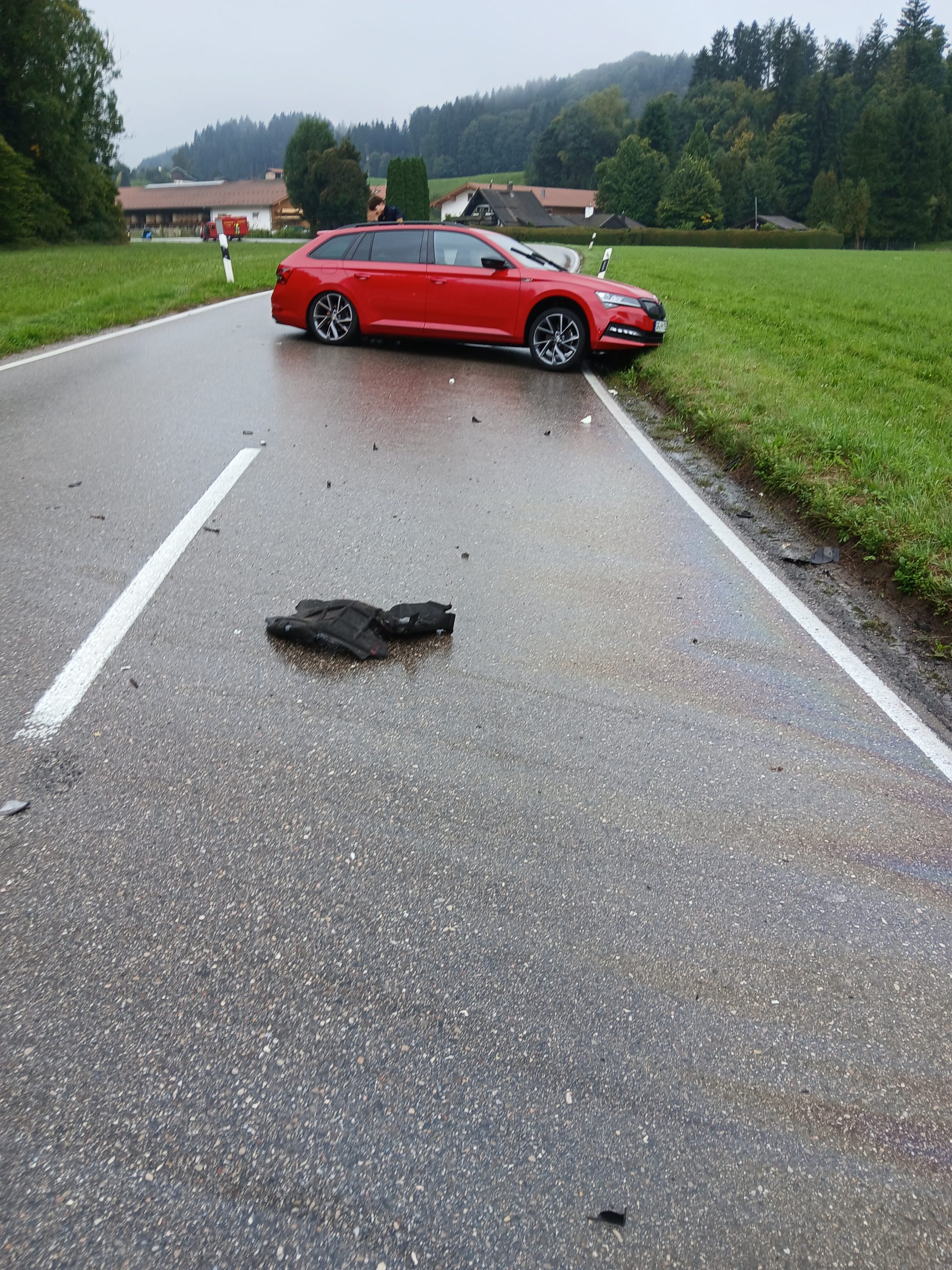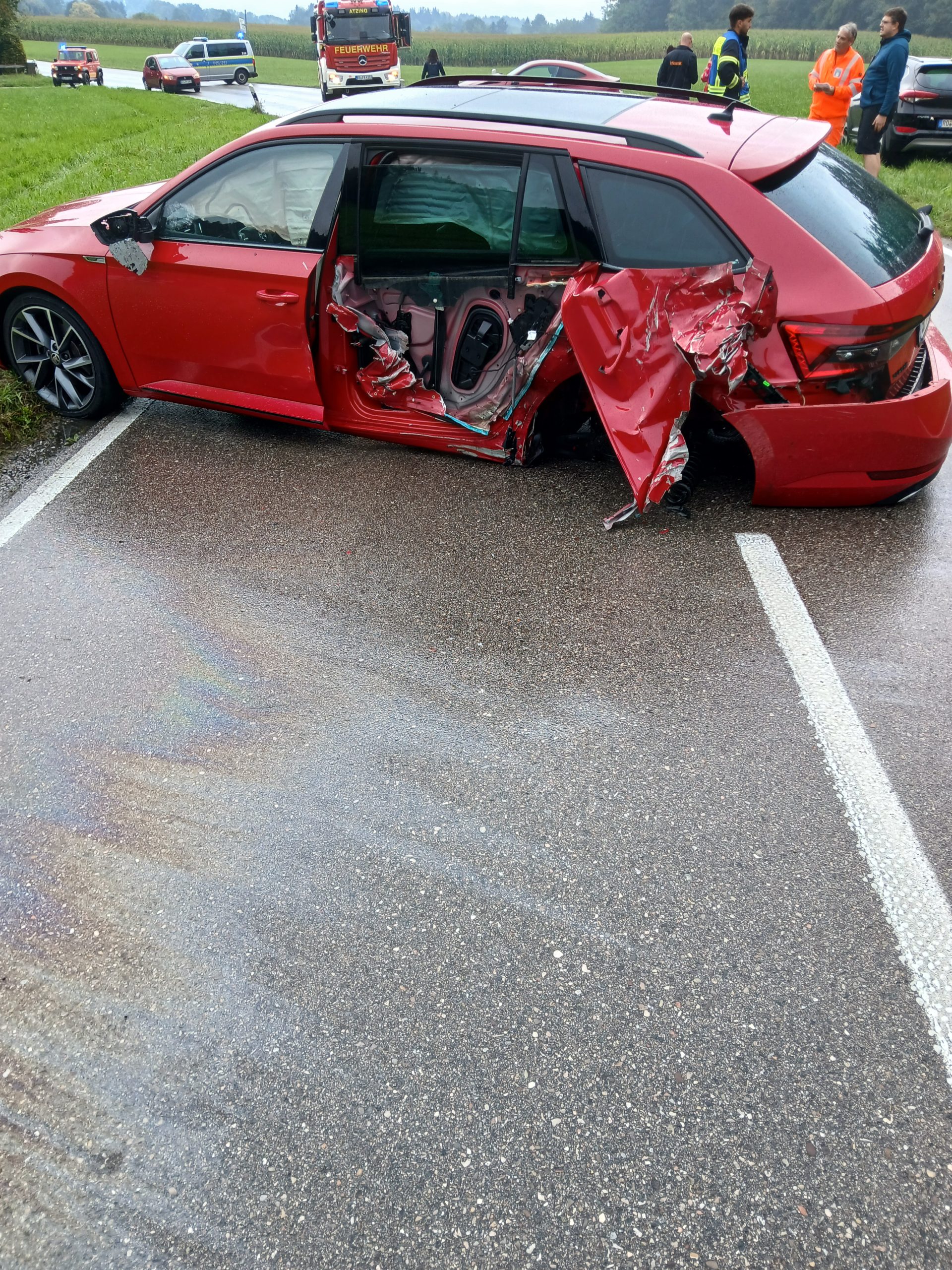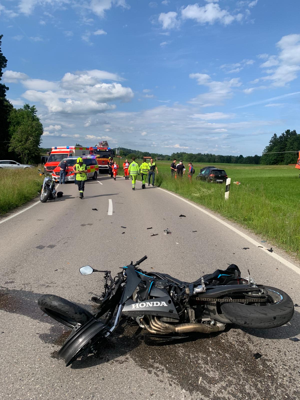 Grund der heutigen Alarmierung war ein Verkehrsunfall zwischen einem Motorrad und einem Pkw. Auf der ST 2093 zwischen Bacham und Prutdorf geriet ein Motorradfahrer in einer Kurve auf die Gegenfahrbahn und kollidierte frontal mit einem entgegenkommenden Pkw. Der Motorradfahrer wurde ca. 30 Meter in ein angrenzendes Feld geschleudert. Wir unterstützten den Rettungsdienst bei der Versorgung des Motorradfahrers und der drei Insassen des beteiligten Pkws. Die Insassen des Pkws wurden mit leichteren Verletzungen ins Krankenhaus gebracht. Der Motorradfahrer wurde mit schwersten Verletzungen ins Klinikum Traunstein geflogen. Des weiteren wurde durch uns der Brandschutz sicher gestellt und eine Umleitung eingerichtet. Nach der Bergung der Fahrzeuge konnte die Straße nach 2 Stunden wieder freigegeben werden.
