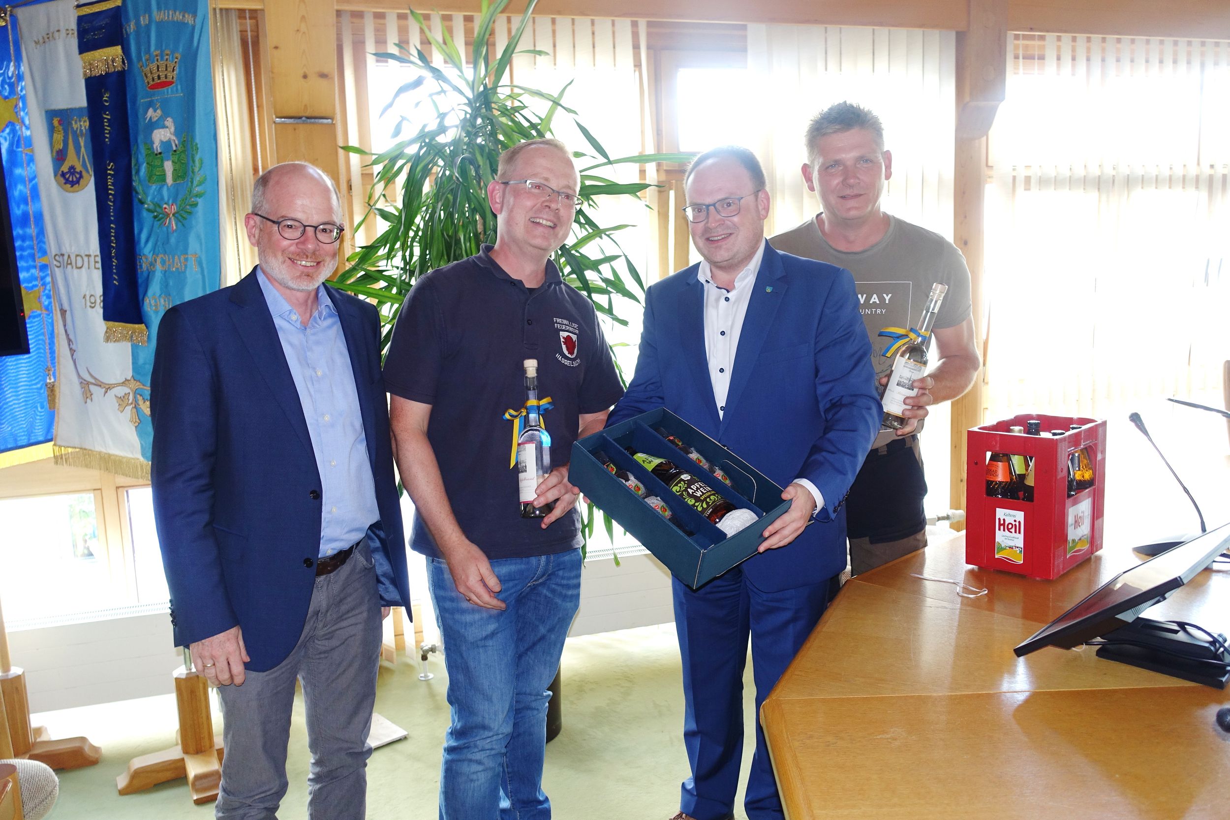 Als vor gut 40 Jahren durch einen Kuraufenthalt und Heimatabendbesuch im Großen Kursaal von Prien der Wunsch des damaligen Kassiers der Feuerwehr von Hasselbach in der Hochtaunus-Gemeinde Weilrod entstand, dass ein paar Jahre später (1986) die Priener Blasmusikanten und die Atzinger Trachtler zum 75jährigen Feuerwehrbestehen nach Hessen kommen mögen, da ahnte man sicherlich noch nichts von einer langanhaltend entstandenen Freundschaft. Inzwischen gab es eine Menge von gegenseitigen Besuchen und Auftritten zwischen den Feuerwehren, mit Musikanten, mit Chören und mit offiziellen Gemeindevertretern. „Daraus ist eine wahre Freundschaft entstanden ganz im Sinne unseres Tourismus“ – so Priens Bürgermeister Andreas Friedrich beim jüngsten Besuch der Feuerwehr von Hasselbach anlässlich eines kleinen Empfangs im Sitzungssaal des Priener Rathauses.