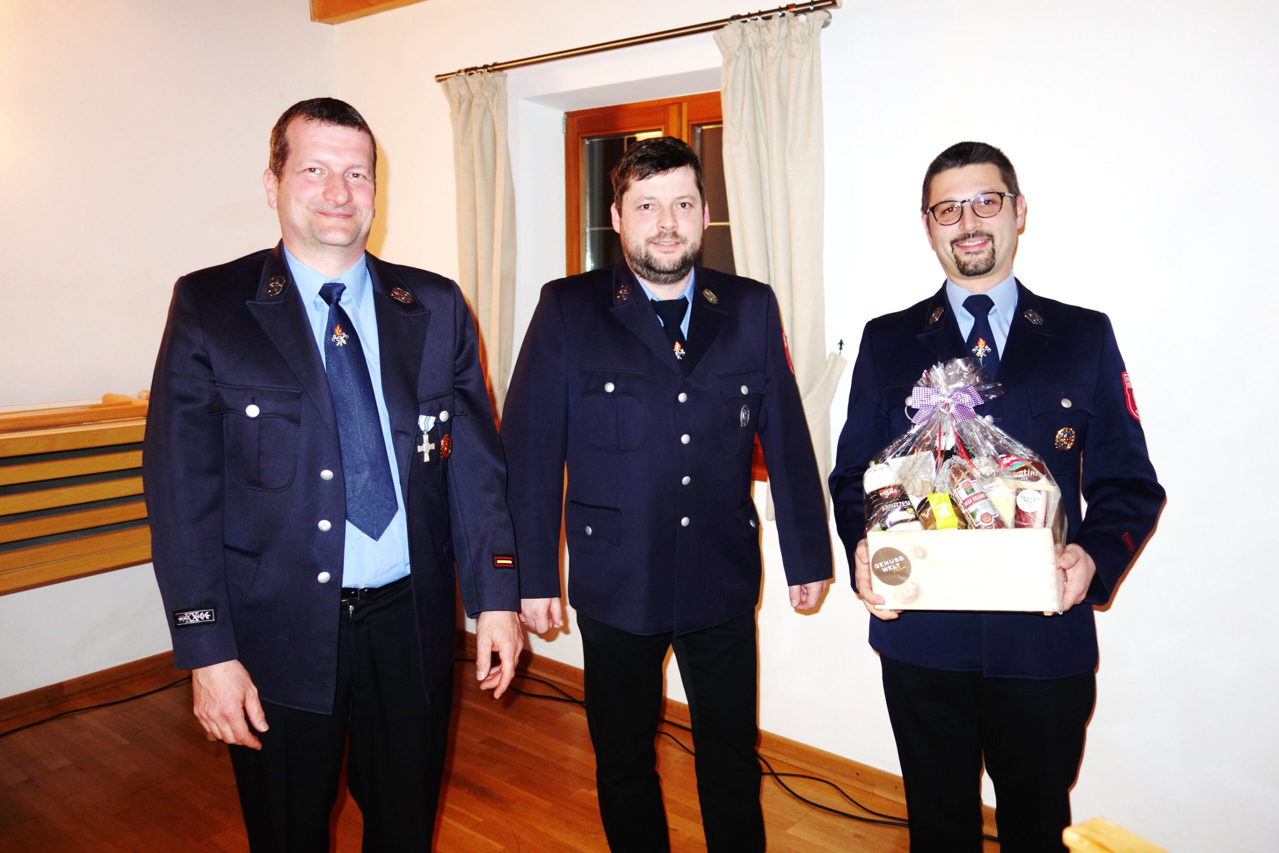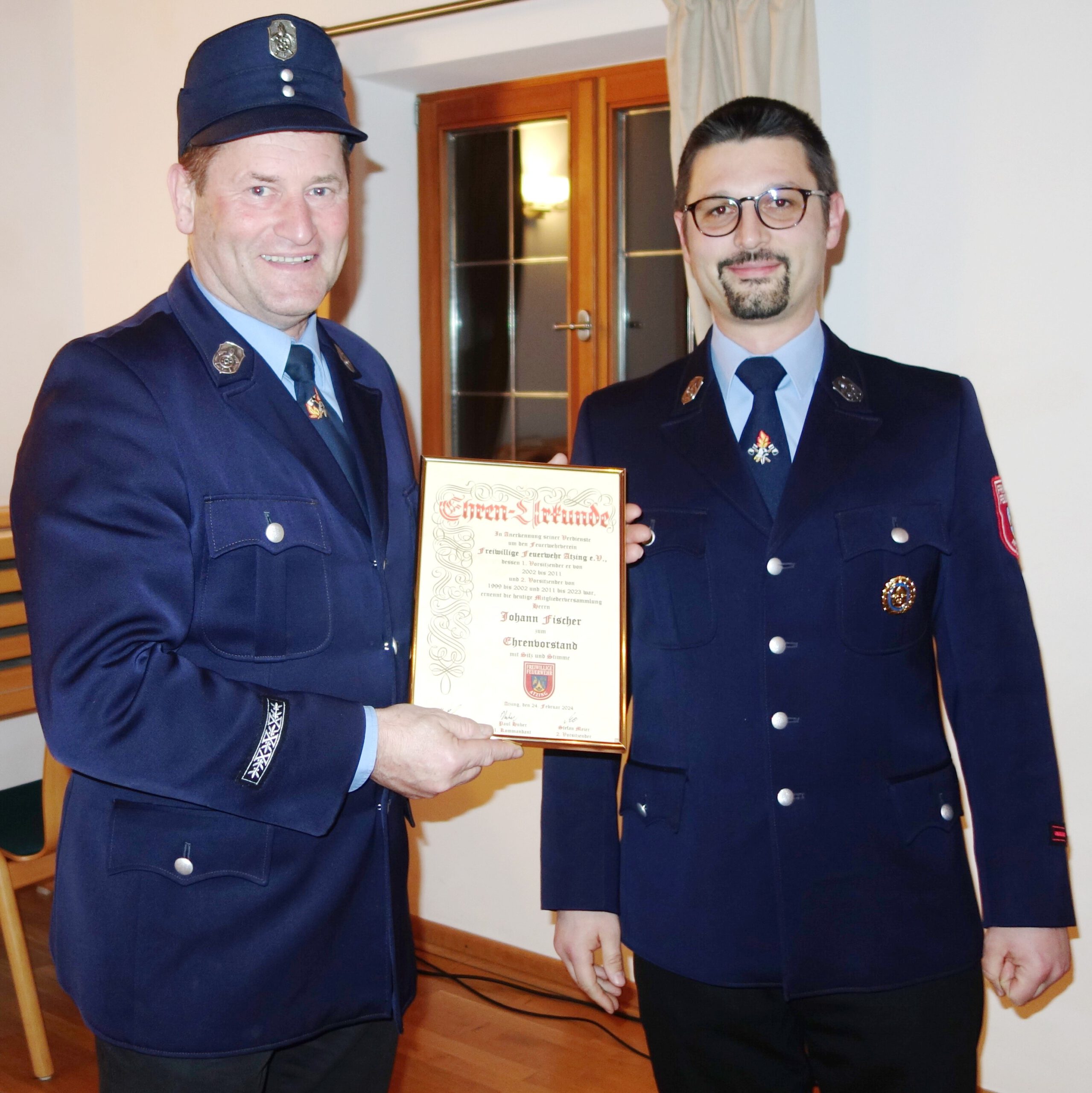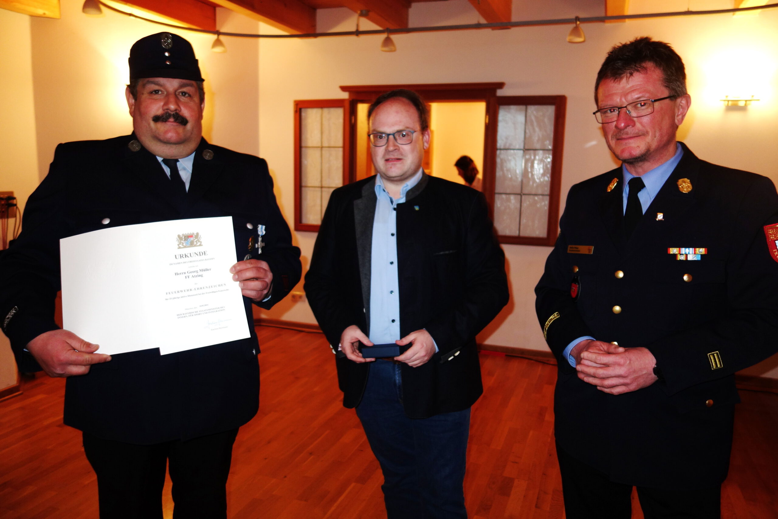 Namens der Kreisbrandinspektion Rosenheim überreichte Kreisbrandmeister Stefan Pfliegl an Georg „Schos“ Müller eine Urkunde, er dankte dabei für insgesamt 25 Jahre aktiven Feuerwehrdienst (ab 2018 in Atzing, vorher in Aidenbach) und für seine Jugendwart-Aktivitäten seit 2020. Zugleich gab Stefan Pfliegl einen Bericht zum Stand der Digitalen Alarmierung und zur Anschaffung einer dritten und dann mobilen Atemschutz-Übungs-Anlage für den Landkreis. „4.500 Feuerwehrleute haben im letzten Jahr an den Landkreis-Lehrgängen mit insgesamt 105 Ausbildern teilgenommen, damit sind wir für Not-Situationen wie zuletzt beim Schneechaos gut gerüstet“ – so der Kreisbrandmeister, der noch informierte, dass auch fortan Feuerwehren in der Ukraine und in Griechenland mit Alt-Ausstattungen unterstützt werden sollen.  Namens des Trachtenvereins Atzing, aber auch des Fördervereins Gemeindehaus Atzing bedankte sich Trachtenvorstand Konrad Huber bei der Feuerwehr, dabei sagte er: „Wir sind im Vereinshaus unter einem Dach, wir haben im Buchenwald von Munzing einen gemeinsamen Festplatz und wir haben das ganze Jahr über gemeinsame Aufgaben und Ziele,  in diesem Sinne wünsche ich Euch und uns wieder ein gutes, gesundes und unfallfreies Vereinsjahr“. Bestandteil der Versammlung war ein gemeinsames Abendessen, spendiert von der Gemeinde Prien und wohl zubereitet vom Gasthaus Stocker. Kommandant Paul Huber und Zweiter Vorstand Stefan Meier dankten Erstem Vorsitzenden Martin Loferer mit einer kulinarischen Genusskiste und für Anna Boggusch von der Jugendfeuerwehr gab es noch Blumen. Der Versammlung ging noch ein gemeinsamer Dank- und Bitt-Gottesdienst zusammen mit der Wildenwarter Feuerwehr und mit Pfarradministrator Gottfried Grengel in der Pfarrkiche Christkönig in Wildenwart voraus.