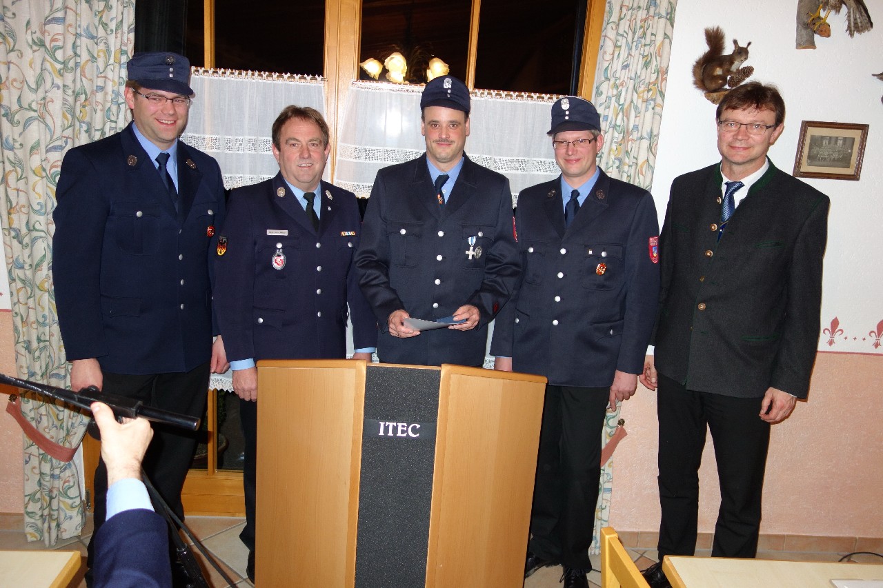 1a: Ehrung für Guido Obermaier und dessen 25 Jahre aktiven Diensts von links: Vorstand Andreas Riepertinger, KBM Franz Hügel, Guido Obermaier, Kommandant Hans-Peter Riepertinger und Bürgermeister Jürgen Seifert.