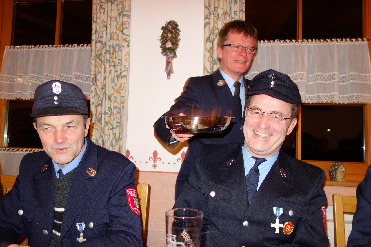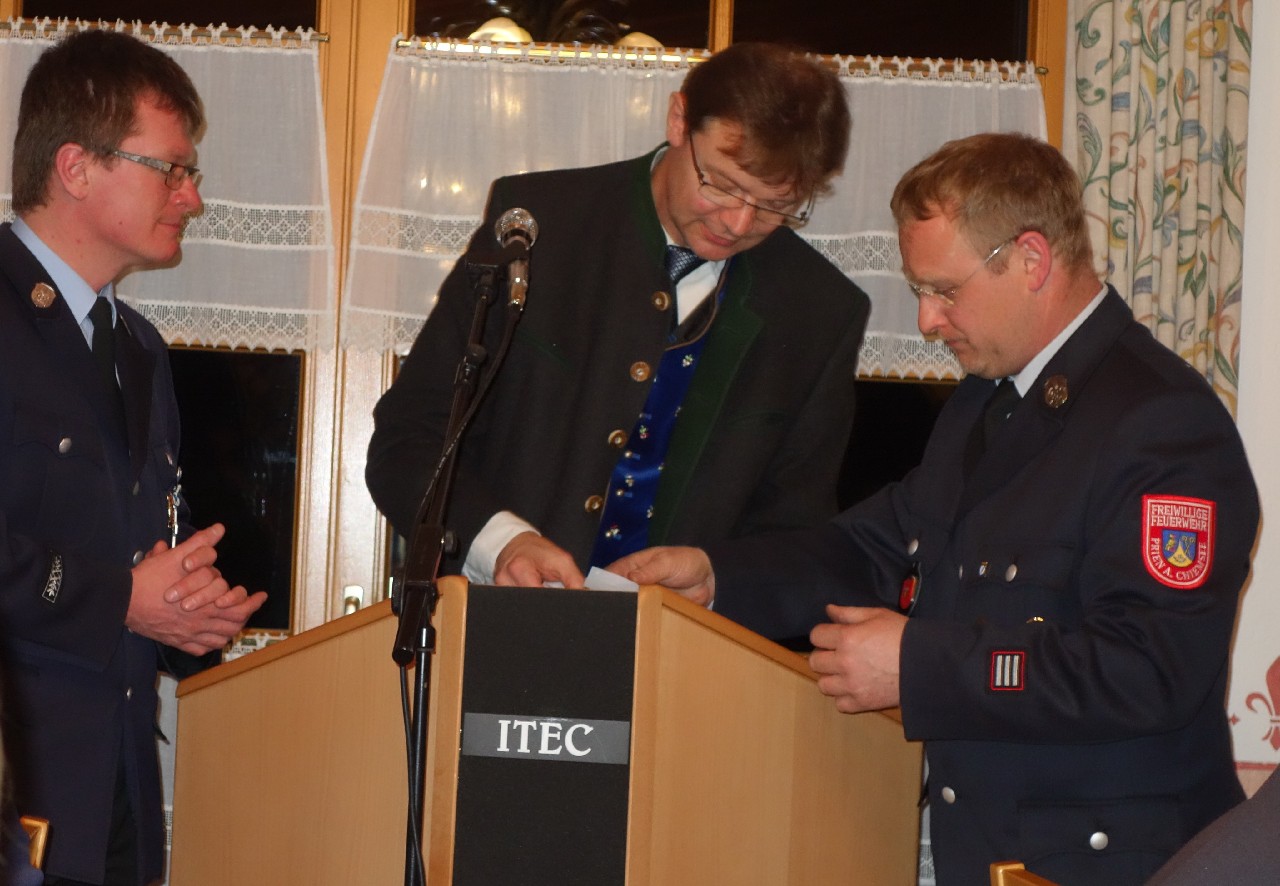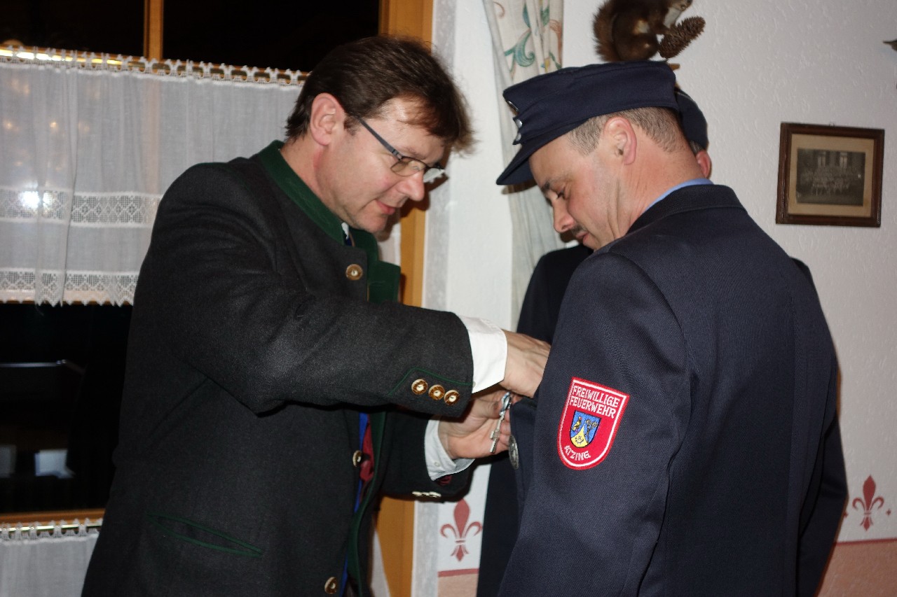 Im Jahr 2014 soll es nach den Planungen des Kommandanten zum Einsatz eines neuen, effektiveren Übungsplanes sowie zu zwei Leistungsprüfungs-Gruppen kommen. Glückwünsche für den guten Gesamtzustand und für die stete Einsatzbereitschaft gab es von Bürgermeister Jürgen Seifert und von Kreisbrandmeister (KBM) Franz Hügel. „Jeder für Jeden“ – dieses Motto gelte nach den Worten von Bürgermeister Seifert in Atzing ganz besonders. Aufgrund veränderter Einsatzbilder bei mehr Sturm und Wasser sagte der Bürgermeister zu, auch weiterhin die Ausbildung und Ausrüstung zu unterstützen. KBM Hügel informierte, dass im Landkreis Rosenheim an den Hochwassertagen mit ca. 7.000 Notrufen in der Leitstelle insgesamt 4.500 Helfer im Einsatz waren, davon waren 3.500 Feuerwehrleute. Zusammen mit Bürgermeister Seifert und der Führung der FFW Atzing nahm der KBM noch eine Ehrung vor. Guido Obermaier gehört seit 25 Jahren als Aktiver der Feuerwehr Atzing an. Er bekam eine Ehrennadel und Urkunde von Bayerns Innenminister Joachim Herrmann für seine vielfältigen Verdienste, unter anderem als Maschinist, Aktivenvertreter und großzügiger Unterstützer bei Veranstaltungen.