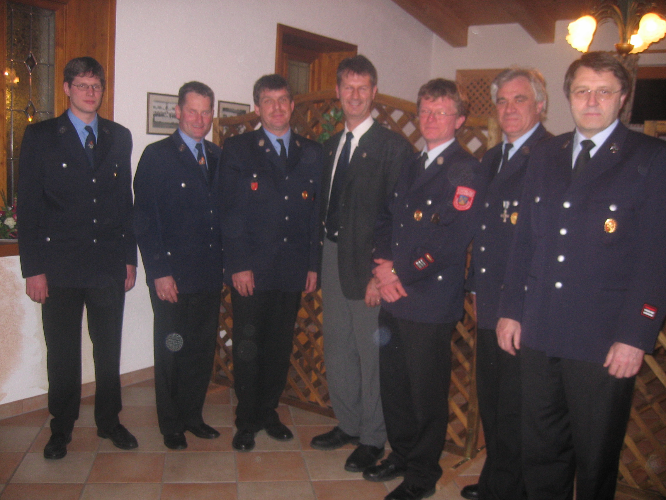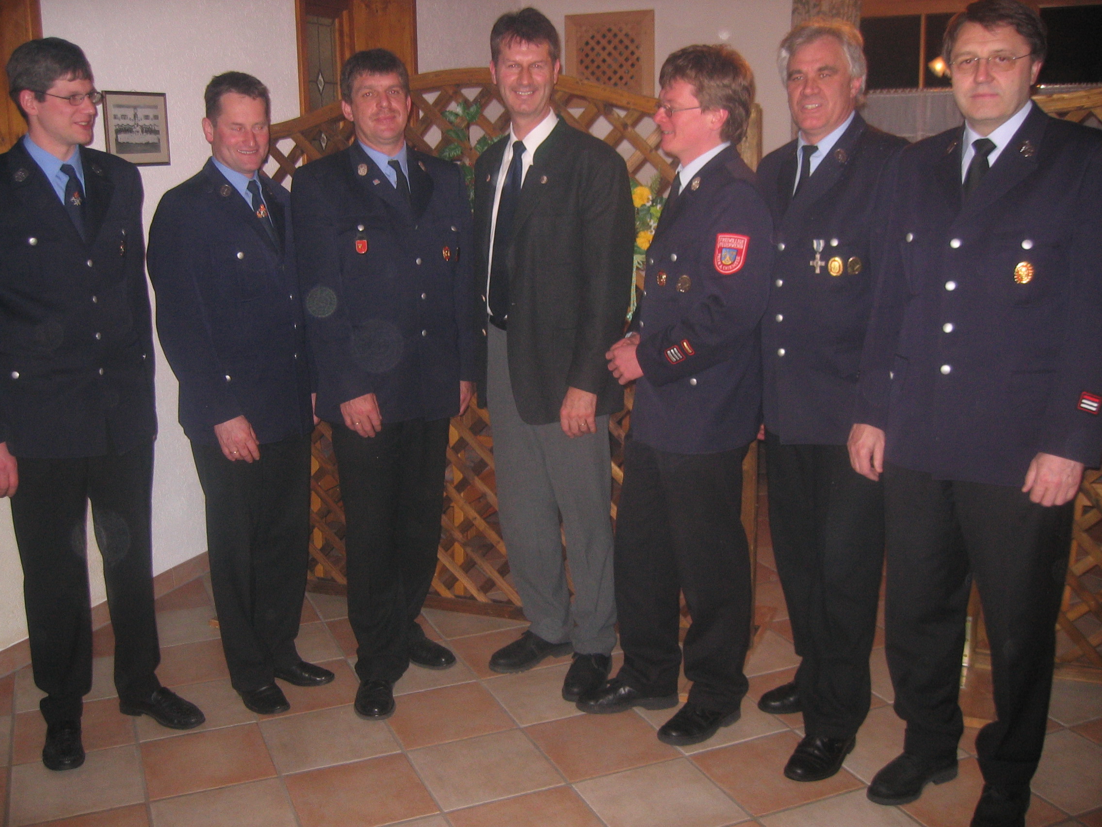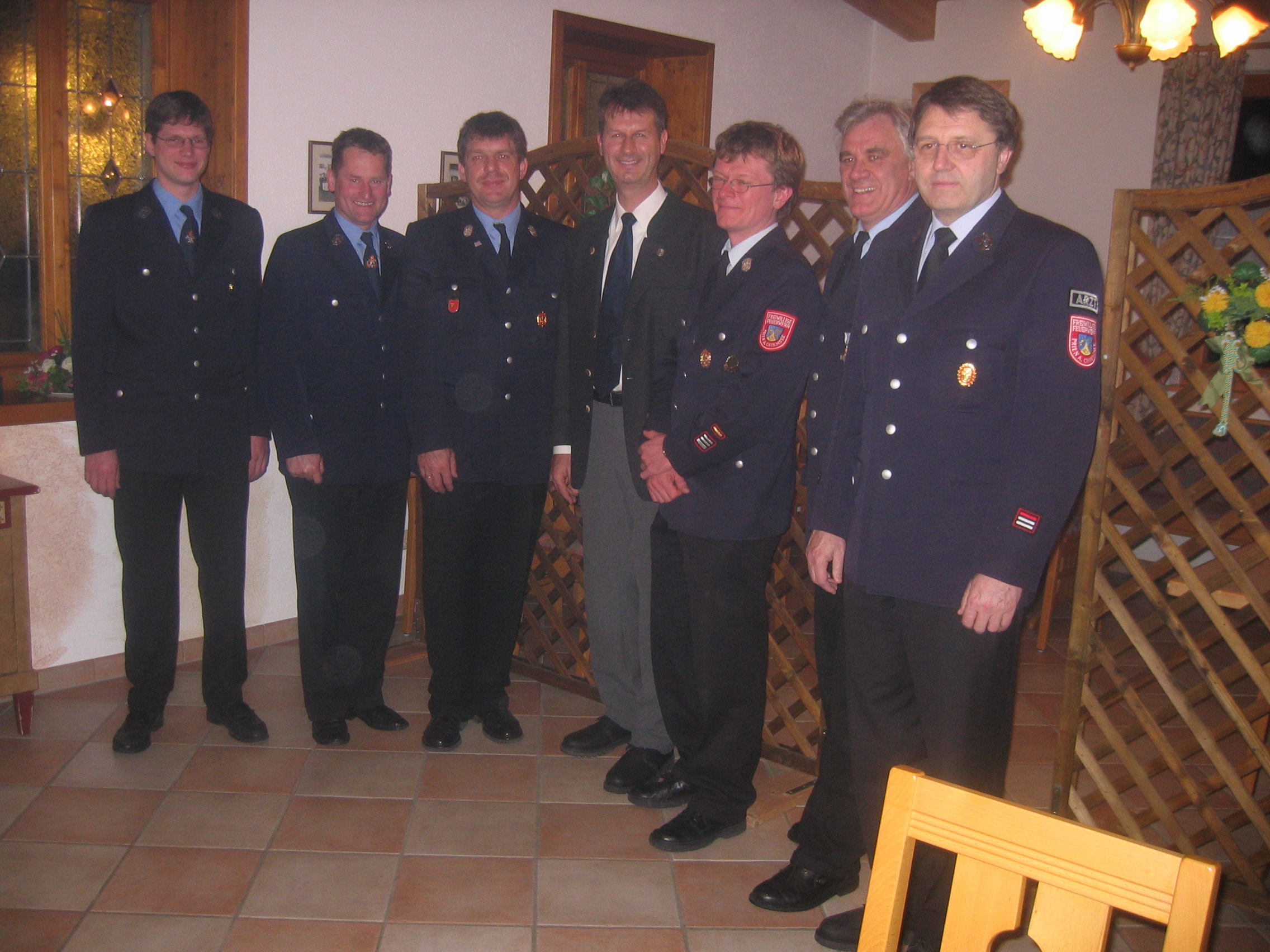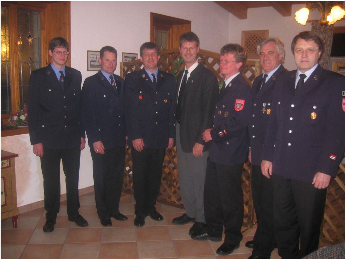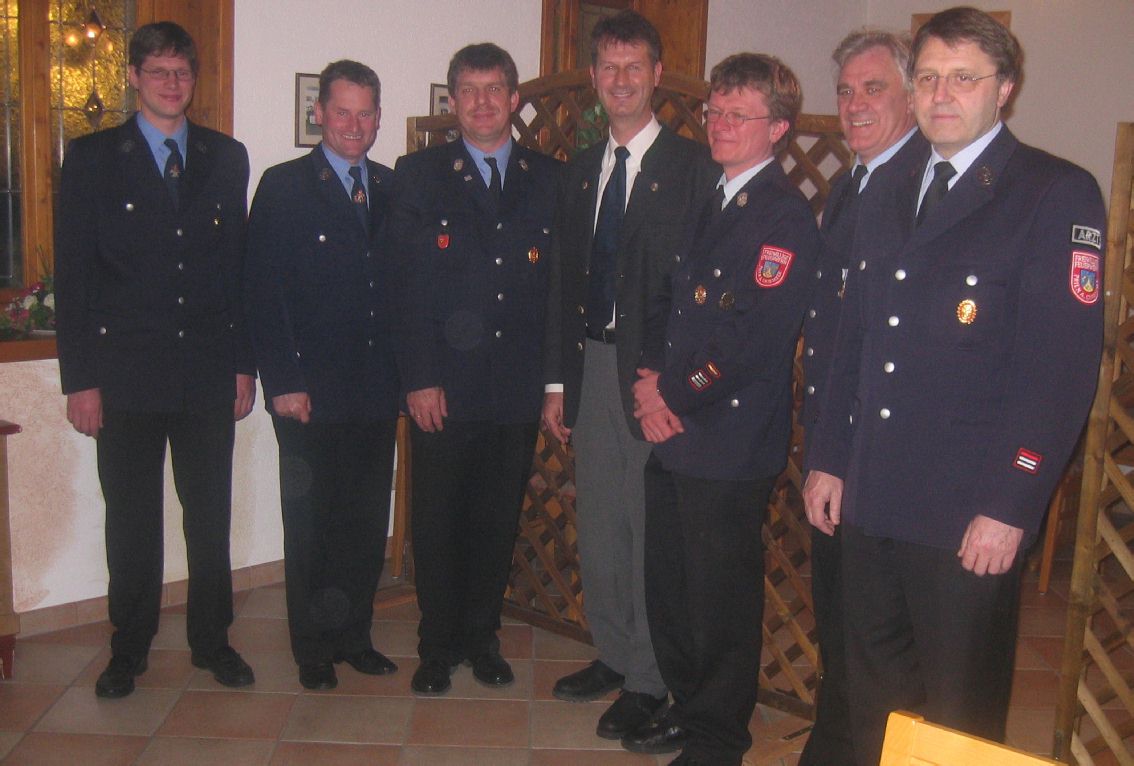 Feuerwehrzusammenhalt in Prien: von links Hans-Peter Riepertinger (Kommandant Atzing), Hans Fischer (Vorstand Atzing), Kreisbrandmeister Franz Hochhäuser, Bürgermeister Christian Fichtl, Stefan Pfliegl (Kommandant Prien), Hans Herzinger (Vorstand Prien) und Dr. Otto Steiner (Feuerwehr-Arzt).