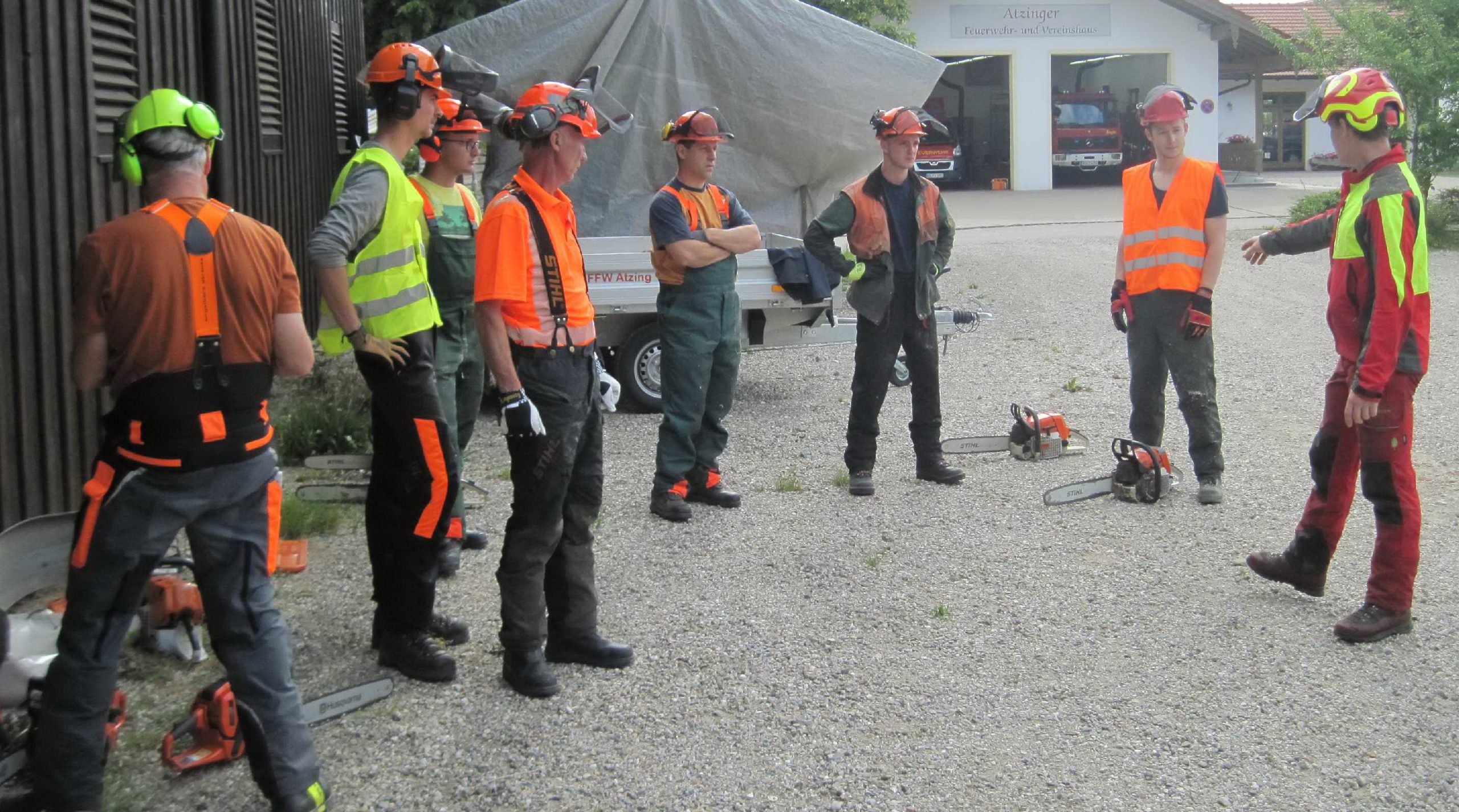 Mit Kursleiter Franz Reiter von der Feuerwehr Litzldorf und vier weiteren Ausbildern aus dem Landkreis Rosenheim wurde bei der Feuerwehr in Prien-Atzing ein Motorsäge-Kurs in Theorie und Praxis abgehalten. Zwölf Teilnehmer aus Söllhuben, Antwort, Hemhof, Bernau und Atzing ließen sich über Sicherheitsvorschriften, Fälltechniken und weitere Themen an zwei Theorieabenden und an einem Praxistag unterrichten. Sehr spannend für die Feuerwehrdienstleistenden war das fachgerechte Zersägen von Baumstämmen im Spannungssimulator (siehe Video). Alle Teilnehmer hatten den vom Kreisfeuerwehrverband angebotenen und durchweg ausgebuchten Kurs bestanden.