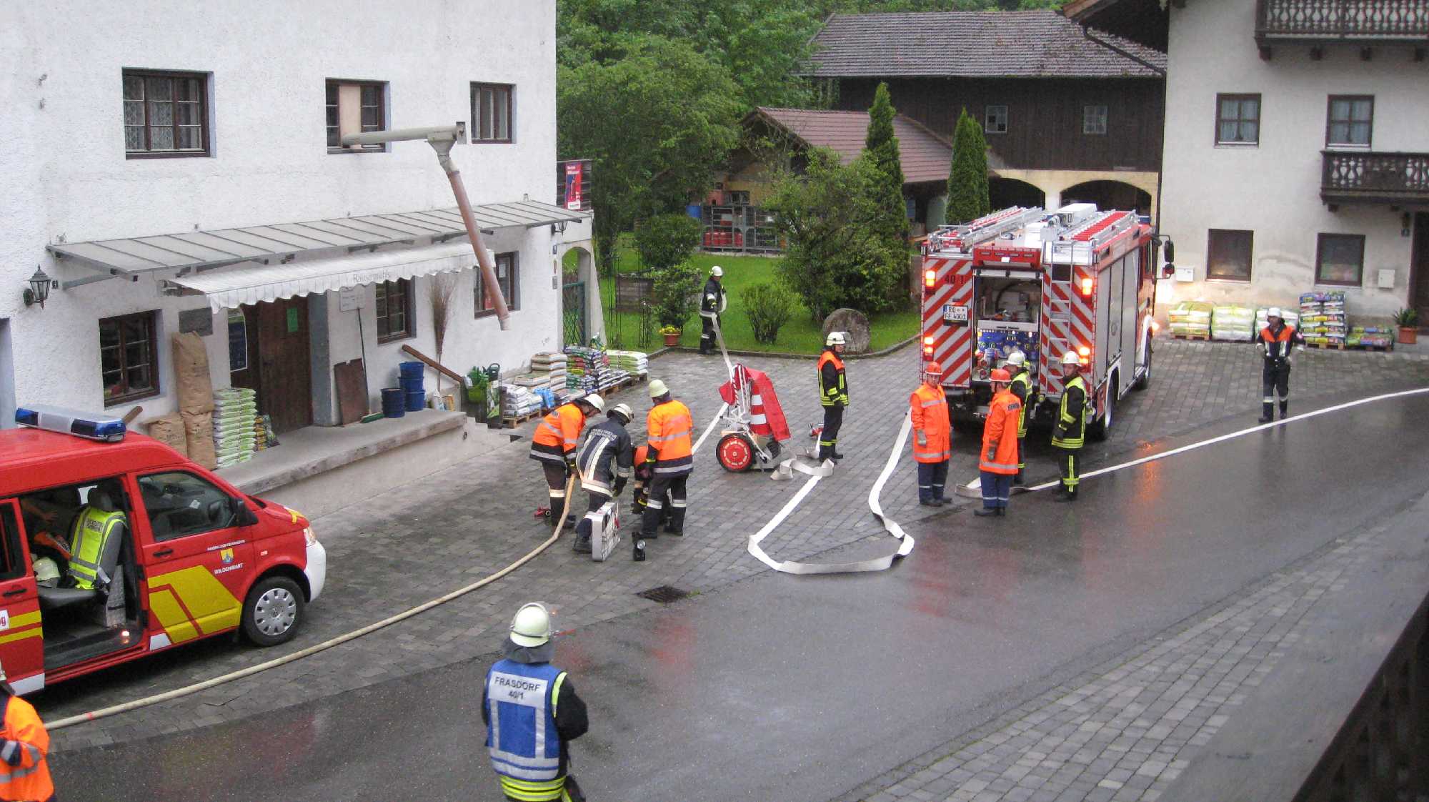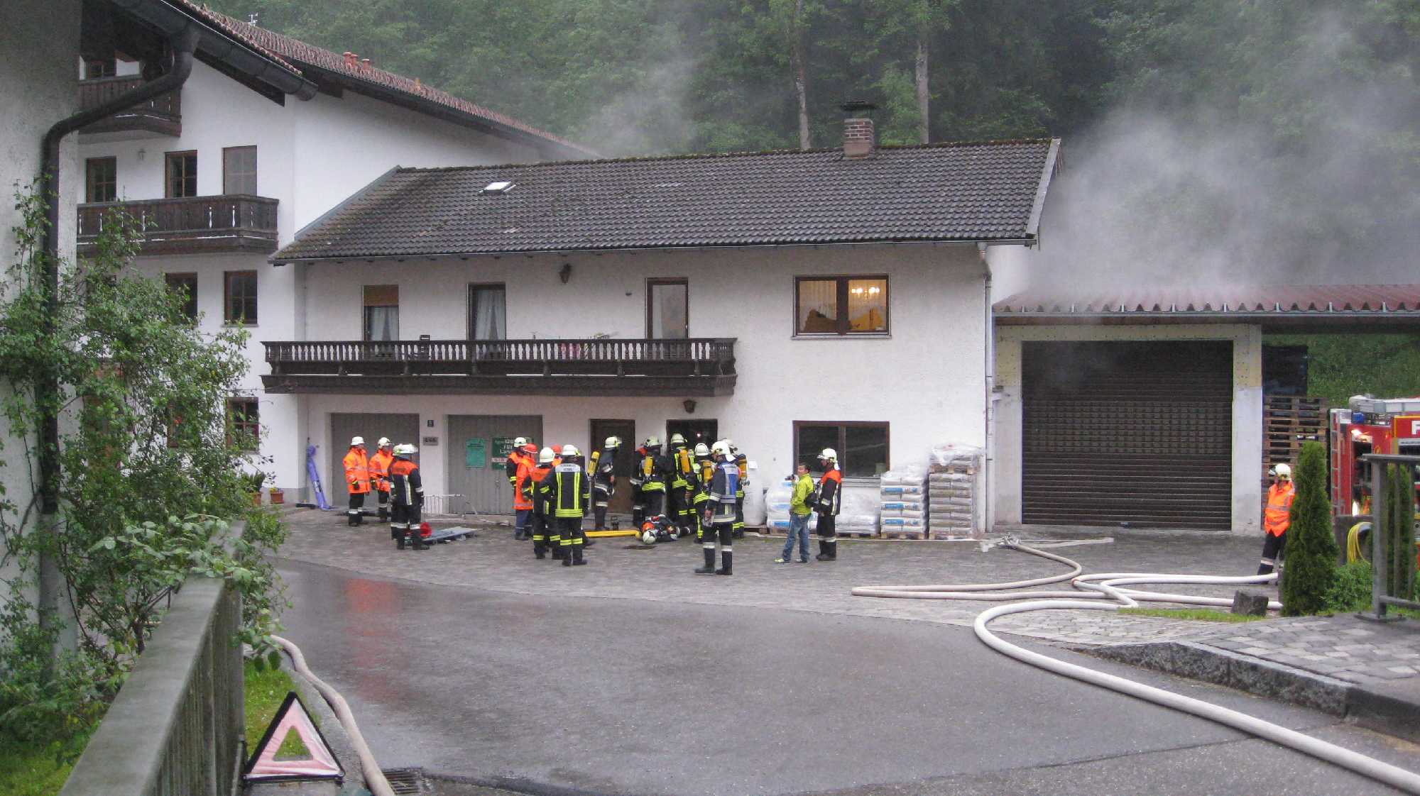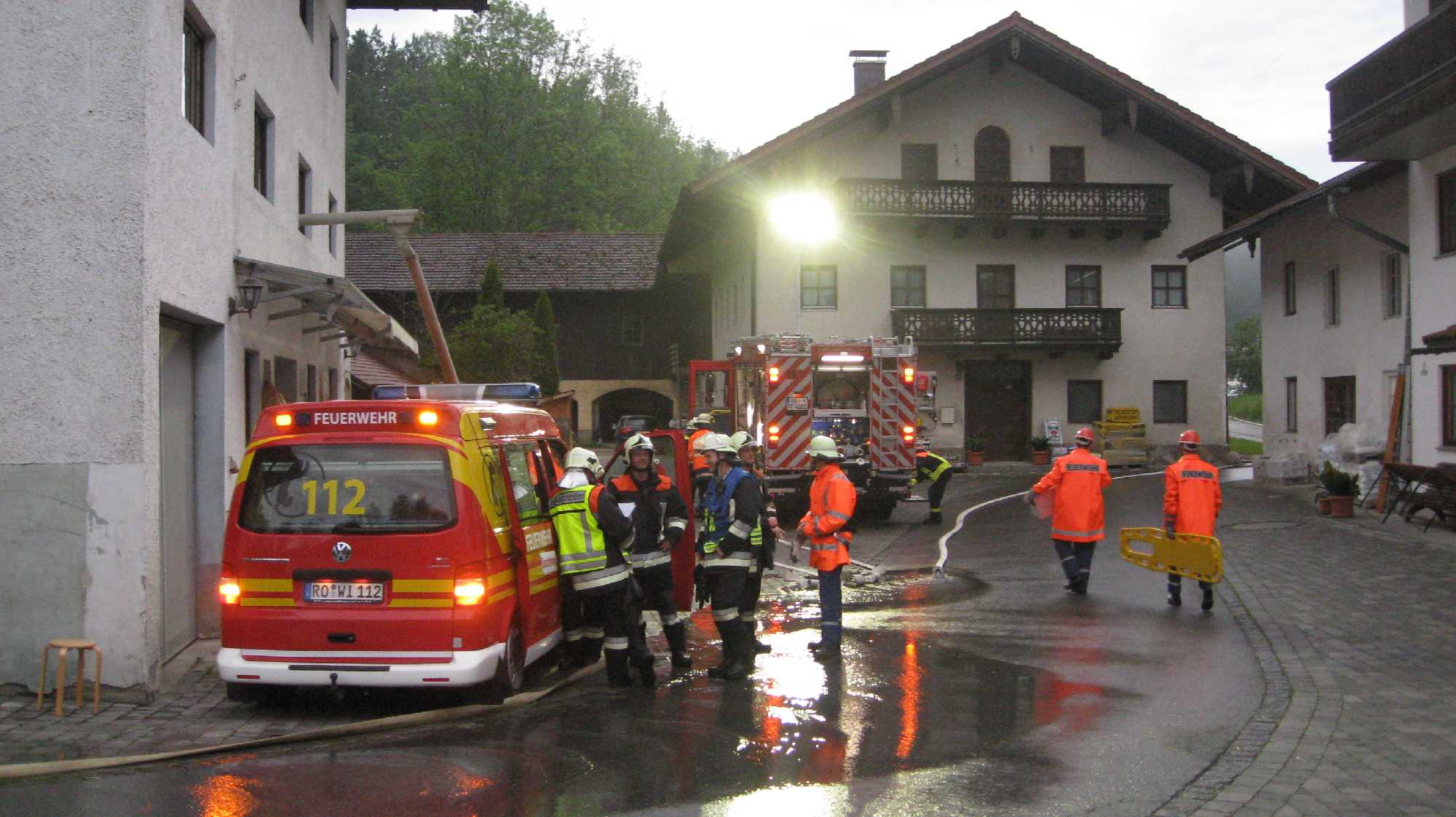 Die Freiwilligen Feuerwehren Wildenwart, Atzing, Umratshausen und Frasdorf übten einen Abend lang gemeinsam, die Leitung oblag der Feuerwehr Wildenwart. Angenommen war der Brand einer Lagerhalle eines Landwirtschaftlichen Lagerhauses in der Rainermühle. Wildenwart. 11/1 übernahm die Einsatzleitung und korrespondierte mit der Leitstelle in Rosenheim. Alle vier Feuerwehren positionierten ihre Tragkraftspritzen an geeigneten Plätzen an der Prien und dem Mühlbach, um Wasser zur Brandbekämpfung zu entnehmen. Da nicht bekannt war, ob sich noch Personen im Brandobjekt befanden, schickte die Feuerwehr Wildenwart einen Atemschutztrupp in das Gebäude voraus. Im Inneren entdeckten die Feuerwehrleute ein Gasflaschenlager. Im selben Moment passierte auch schon das Unglück. Eine der Flaschen explodierte und verletze den Voraustrupp schwer. Der Atemschutz Sicherungstrupp aus Umratshausen drang in das Gebäude vor und brachte seine schwer verletzten Kameraden aus dem Gefahrenbereich. Die Feuerwehren Atzing und Frasdorf stellten zur Absicherung weitere Atemschutztrupps bereit. Aufgrund der schweren Verletzungen musste ein Rettungshubschrauber angefordert werden. Den dafür notwendigen Landeplatz richteten die Feuerwehren Atzing und Umratshausen auf der gegenüberliegenden Wiese ein. Ausgebildete Sanitäter der Feuerwehren versorgten die Verletzten bis zum Eintreffen des Rettungsdienstes. Bei der anschließenden Übungsbesprechung waren sich alle Feuerwehrleute einig, dass ein sehr interessantes und durchaus realistisches Einsatzszenario geprobt wurde. Für Getränke und Brotzeit sorgte die Gemeinde Frasdorf.